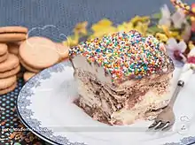 | Main ingredients | Condensed milk, ladyfingers or a Marie biscuit-equivalent (corn starch biscuit, or "biscoito de maisena") |
