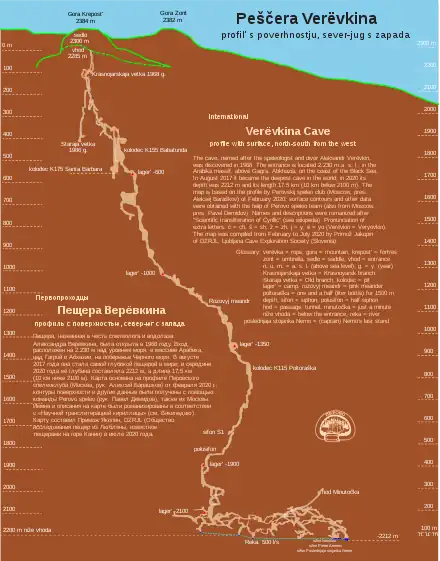 - ↑ Ljubimov, Pëtr; Demidov, Pavel (12 March 2018). "Экспедиция в Верёвкина март 2018. Глубина пещеры достигла -2212 метров" [Expedition to Verëvkina, March 2018. The depth of the cave reached −2212 meters.] (in Russian). incave.org. Retrieved 17 February 2020.