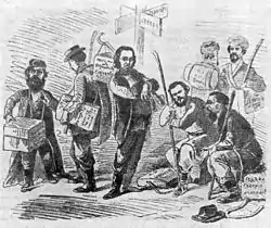 Yakushkin (leftmost) among the travelling Russian ethnographers. The 1864's Iskra caricature