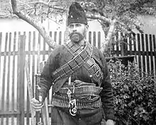 Mladenović was born in the village of Jačince, in the region of Ovče Polje, at the time part of the Ottoman Empire. He worked as a peasant in his village and became an Exarchist at the end of the 19th century. When the Internal Macedonian Revolutionary Organization (IMRO) started assassinating and murdering people who identified as Serbs in the Kumanovo region, Čiča Pavle took his sons and nephews to the woods and joined the precursor to the Serbian Chetnik Organization. He started guerilla fighting in springtime 1903, as the first Serbian vojvoda, a year before the establishment of the Serbian Committee.[1][2] His band had strict orders of protection, and it fought until 1905 without major clashes, defending Serb villages from Bulgarian nationalist bands of the IMRO. In April 1905 he participated in the Battle of Čelopek alongside commanders Doksim Mihailović, Savatije Milošević, Lazar Kujundžić, Vojislav Tankosić, Aksentije Bacetović and Borko Paštrović. During the battle, he took the Čelopek height and thus prevented the encirclement of the Serbian bands from the Albanian bashi-bozuks.[3] Shortly thereafter, he and Bacetović were surrounded by the Ottoman army near the village of Beljakovac.[4][5] Čiča Pavle, Bacetović, and everyone in their bands was killed.