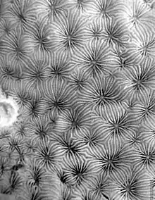 Colonies of Pavona bipartita are either submassive or encrusting, and can be a metre (yard) across. The corallites are shallow depressions with poorly defined walls. They are evenly distributed over the undulating surface of the colony, and there are a network of uneven raised ridges between them. The columella are small and the septacostae extend over the ridges and are arranged in two alternating orders. This coral is usually some shade of brown.[3]