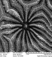 The corallites have strongly alternating septo-costae, giving the coral a flower-like pattern seen on the surface of their structure.