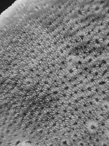 Pavona duerdeni, the porkchop coral, is a coral that forms clusters of cream-colored lobes or discs.[1] They grow in large colonies, divided into ridges or hillocks. The coral is considered to be uncommon due to its low confirmed abundance, yet they are more commonly found in Hawaii, the Indo-Pacific, and  the Tropical Eastern Pacific. They make up some of the largest colonies of corals, and have a slow growth rate, as indicated by their dense skeletons. Their smooth appearance is due to their small corallites growing on their surface.[2]