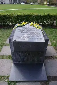 A memorial stone for the leaders of ŻZW in the Warsaw Ghetto Paweł Frenkiel and Dawid Moryc Apfelbaum on ul. Dubois (Dubois Street) in Warsaw. (Part of the Memorial Route of Jewish Martyrdom and Struggle in Warsaw)