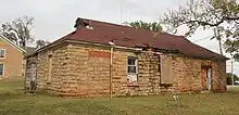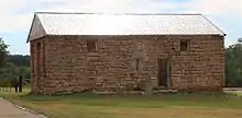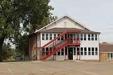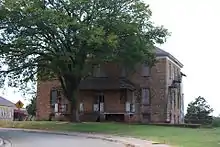 This is the oldest building in the district, having been constructed in 1876. The Superintendent's Building was unoccupied at the time of the NRHP application, when reported some significant structural damage parts of it. Originally built as an office and residence for the Indian Agent, it became the office and residence for the school superintendent around the turn of the 20th century, giving it its current name.[8] It is a two-story structure, built in Queen Anne style, of cured ashlar sandstone. It has a wrap-around porch supported by wooden columns which rest on stone piers. This is not the original porch, but a replacement constructed in 1916. A porte-cochere was added to the west side of the building sometime after 1916. The building also has a front-facing gable and a side-facing gable There is a kitchen with a shed roof on the south side and a hip-roofed room in the L-shaped space formed by the kitchen and the side-facing gable wing. Both of these additions are roofed with green composition shingles, while the main building has asbestos shingles. Originally, these structures had wood-shingle roofs.[8]