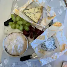 Selection of cheese from Paxton & Whitfield wrapped in branded wax paper.
