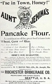 To distinguish their pancake mix, in late 1889 Rutt appropriated the Aunt Jemima name and image from lithographed posters seen at a vaudeville house in St. Joseph, Missouri.[1][7] However, Rutt and Underwood could not raise enough capital and quickly ran out of money.[1] In 1890, they sold their Aunt Jemima Manufacturing Company to the Randolph Truett Davis Milling Company (also in St. Joseph, Missouri), then the largest flouring mill on the Missouri River, having an established reputation with wholesale and retail grocers throughout the Missouri River Valley.[1][2][8]