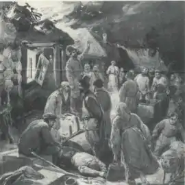 The first mention of "Peasants" dates back to 1 January 1897 when Chekhov wrote to Elena Shavrova from Melikhovo: "I am busy, up to my throat: write and cross out, write and cross out again..." When he started working on the novella is uncertain, but it was completed by the end of February 1897. On 1 March he wrote to Alexey Suvorin: "How about this for a misfortune? Have written a story on the life of peasants, but they told me it won't pass censorship and has to be cut by half." The story was sent to Russkaya Mysl in mid-March; between 15th and 18th, according to Chekhov's two letters to Viktor Goltsev.[1]