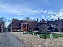 The original 17th century timber-framed house was enlarged in 1910 under the architects James Edwin Forbes and John Duncan Tate (as Forbes and Tate) in the Arts and Crafts style. Originally a farmhouse, the barns and outbuildings were converted into a single large residence.[1] Forbes and Tate specialised in converting old buildings into houses, the Buckinghamshire edition of the Pevsner Architectural Guides describes Pednor House as their "most extensive and successful conversion" that created a "picturesque Tudor courtyard house" [2] Forbes and Tate commissioned Gertrude Jekyll for a garden planting plan around the sundial at Pednor House. In his 2000 book The Gardens of Gertrude Jekyll, Richard Bisgrove described Jekyll's detailed plan for Pednor House as creating planting in "carefully disposed in repeated and irregular groups to provide a low mosaic of flowers and foliage throughout the year".[3]