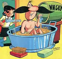 One of the most enduring characters in the history of Italian comics, Pedrito el Drito was created by Terenghi in 1952, making his first appearances as a naive cowboy in the appendix to comic books Forza John! and Rocky Rider.[1][2] Promoted to sheriff, in 1953 his stories started being regularly published in the comic magazines Il Monello and Intrepido.[1] In the 1990s the comic series was published in Corriere dei Piccoli and Lupo Alberto.[1] In spite of its western setting, the series was built as a humorous family saga based on the typical characters of an aggressive wife and a henpecked husband.[1]