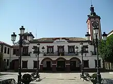 The City Hall is located in the Plaza de España (Spain square), at the center of town, and has been remodeled several times to reach its current state. It emphasizes the tower Historicist-style while retaining the sole remnant of the original Old Town Hall, built in the early twentieth century in the neo-Mudejar style (a sixteenth century Spanish architectural style). In 1946 the current building was completed, a slender design capped with a cover dome. Its forms and curves contain eastern elements and it is ornamented with dovecotes and an upper turret.