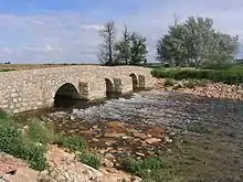 A Roman bridge, known as the Molino de la Torre bridge (Mill Tower Bridge) (39°20′23.85″N 2°54′6.74″W / 39.3399583°N 2.9018722°W), carries the Serranos Way across the Záncara River at the edge of the municipal boundary with Socuéllamos. It is a stonework construction with three arches of equal size and a smaller blind arch. The Serranos Way has the remains of a Roman road of some 6 metres width which once linked Complutum (now Alcala de Henares) with Cartagonova (now Cartagena). The Roman road has become progressively destroyed by the cultivation of crops.[7]