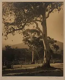 She showed in a group exhibition at Geelong Art Gallery in July 1922[61] and in 1923 she exhibited in a Colonial Prints Exhibition run by the English magazine, Amateur Photographer. Her photograph Mist in the Mountains was reproduced in Cameragraphs, and included in the first Exhibition of the Australian Salon of Photography in 1924, the only Australian woman to be included in this exhibition. In a July 1924 review of a group exhibition at Queen's Hall, critic J. S. MacDonald remarks that "Pegg Clarke's three photographs of landscape motifs are excellent."[62] In October, she participated in a group show at the May Club, Netter Buildings, Gresham street, Adelaide about which it was reported that; "Miss Pegg Clarke, of Melbourne, shows some exquisite photographic studies, mostly of gum trees and country scenes. A delightful atmosphere pervades her pictures."[63] On return from touring in Europe in October 1929, in 1930 Clarke held a solo exhibition at The Little Gallery in Melbourne which was reviewed by Arthur Streeton: