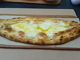 The peinirli (or penirli) is an elongated, open pie made in a boat shape. They contain a substantial amount of yellow cheese and, optionally, meats or vegetables.[1] Peinirli originated in Turkey, where it is known as peynirli.[2] There are two types of pide: peynirli pide, in which cheese entirely covers the surface of the filling, and karışık pide, which has cheese only as part of the filling (usually one third).
