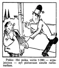 Pekka Puupää is a Finnish text comic and film character, created by Ola "Fogeli" Fogelberg. The character appeared 1925–1975 in the popular comic Pekka Puupää and 1952–1960 in thirteen films (Pekka ja Pätkä) produced by Suomen Filmiteollisuus. Pekka Puupää is one of the most well-known and beloved characters in the Finnish popular culture.