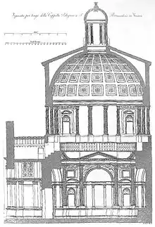 The presence of Michele Sanmicheli's preliminary designs in the Uffizi Gallery has made it possible to learn about the evolutionary stages of the work: the Veronese architect, in fact, at first planned to build a chapel with a Greek-cross plan larger than the one actually realized; externally, then, the surface was to be more articulated and decorated thanks to the presence of tall pilasters, of Corinthian order placed on pedestals, and the dome, visible even from outside. A monumental project, taking inspiration from the Pantheon in Rome and Raphael's Chigi Chapel in the Basilica of Santa Maria del Popolo. The final design underwent numerous changes, yet the work retained a solemn appearance, especially inside.[17]