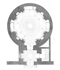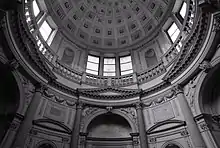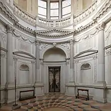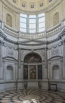 The chapel is accessible exclusively from the church hall through a monumental entrance portal, from which one is first ushered into a square vestibule, covered by a coffered barrel vault, and then into the building proper, through a second portal.[18] The monumental vestibule is a rather original solution and a result of the need to prevent the structure from interfering with the Avanzi and Medici chapels already present in San Bernardino.[11] The building has a circular plan with a diameter of 12 meters and a height of 20.5 meters, divided into two orders by a balcony with parapet and covered by a coffered dome crowned by a lantern;[18] the diameter of the first order is smaller than that of the upper one, a feature that distinguishes this chapel from others, where, moreover, the dome often stands directly on the first order.[19][20]