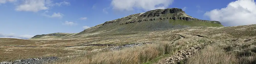 The Pennine Way links the summit to the village; the route is around 3.1 miles (5 km) in length as the Way curves initially to the north before turning east to reach the summit.[11] The more direct route that traverses the southern 'nose' of the hill is the route usually taken by those attempting the Yorkshire Three Peaks Challenge, as the walk is usually (but not exclusively) done in an anti-clockwise direction starting and finishing in Horton in Ribblesdale. The other main hillwalking route on the hill heads north from the summit to reach Plover Hill before descending to join Foxup Road, a bridleway at the head of Littondale.[3]