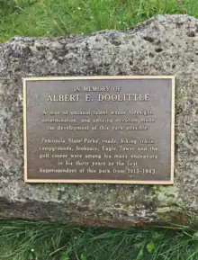 Peninsula State Park was established in 1909. Land was acquired for an average of $20 per acre. The state legislature officially established Peninsula as a state park in 1910, making it the second state park in Wisconsin. The primary purpose of building a state park in the northern part of Door County was to afford a playground and resting place for those whose financial conditions and locations precluded the possibility of owning summer cottages. The park was originally free and did not charge admission in order to achieve the purpose of keeping visitors' expenses to a minimum, so that toilers would be permitted to share in the pleasure and benefits of outdoor life.[7] With a budget of less than $2,000 per year, work on the park proceeded slowly. Early projects included miles of roads, scenic lookouts, campgrounds, two towers, and initial portions of two golf courses. During the 1919 season, which marked the end of Peninsula's first decade, an estimated twenty-thousand people visited Peninsula. Around this time, Doolittle established Door County Days, a summer picnic with music and sports events attended by thousands. Peninsula was becoming a premier outdoor playground in the Midwest.