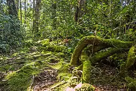 Above 1000 meters elevation, the dipterocarps that characterize the lowland forests become fewer, and trees in the beech family (Fagaceae) become predominant, including evergreen oaks (Quercus) and species of Lithocarpus and Castanopsis. Trees in the Myrtle family (Myrtaceae) and conifers are also common, including species of Agathis, Dacrydium, and Podocarpus.[3]