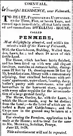 After his death Penmere Manor was advertised for rent. The rental notice is shown which gives a good description of the whole property in 1829.