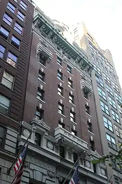 The current building replaced smaller structures at 30 and 32 West 44th Street.[5][6] The adjacent block of 44th Street is known as Club Row, which contains several clubhouses.[7] When 30 West 44th Street was developed at the beginning of the 20th century, several other clubhouses were being built in the area.[8] By the early 1900s, these other clubs included the New York Yacht Club, Harvard Club, New York City Bar Association, Century Association,[9][10] and the City Club of New York,[11] all of which remained in the area at the end of the 20th century.[12] Prior to the development of 30 West 44th Street, the neighborhood contained a slaughterhouse, stables for stagecoach horses, and a train yard for the elevated Sixth Avenue Line.[13] There were historically many stagecoach stables on 43rd and 44th Streets between Fifth and Sixth Avenues,[14] but only a few of the stables remained by the end of the 20th century.[13][14]