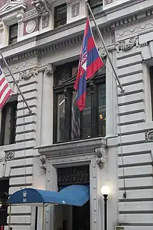 By 1925, DKE wished to sell the building at 30 West 44th Street and relocate to larger headquarters. The Army and Navy Club of America bought the building in June 1925, although DKE planned to remain in the building until it found a new clubhouse.[71][72] The Army and Navy Club had been forced to relocate from its previous clubhouse at 112 West 59th Street, which had been sold to a developer that February.[73] DKE leased space for a new clubhouse at 5 East 51st Street in August 1925 and relocated there.[65][74] The Army and Navy Club moved into the building that October. The club's finances suffered in subsequent years, as the enactment of Prohibition in the United States in 1919 had caused the club's membership to decline.[65] The Army and Navy Club filed for bankruptcy in June 1933;[75][76] at the time, the Army and Navy Club only had 500 members and was struggling to collect $40,000 in membership dues.[65] The clubhouse closed at the end of that month.[77][78]