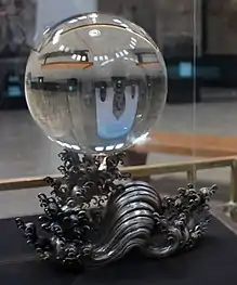 The Asian Gallery is mounted in Harrison Rotunda, which measures ninety feet across and ninety feet from the floor. Since its completion in 1915, this gallery has showcased the Chinese collection.[27][22] One of the central figures is a ceramic statue of a Luohan, reputed to be one of a group of eight or ten statues from a cave in Yizhou that date between 947 and 1234 CE.[28] Other rare Chinese works of art on display are two of the six horse panels from Emperor Taizong's Mausoleum in Shaanxi Province. Each of these horses had names and poems commemorating their service in the fight to unify China during the Tang dynasty. The secular focus and historic realism of these reliefs marked a new direction in Chinese art.[29] Four of the panels are at the Beilin Museum in Xi'an, while the only two to have left China were donated to the Penn Museum by Eldridge R. Johnson, the founder of the Victor Talking Machine Company.[30][31] Johnson also donated the perfectly spherical crystal ball that sits in the center of the gallery, which is supposed to have belonged to Empress Cixi (1835–1908).[31] Along with an Egyptian statue of Osiris, the Chinese crystal ball was stolen in 1988. Shortly afterwards, a student found its elegant silver stand, a stylized ocean wave, in a culvert not far from the museum. The items were recovered in 1991 after a museum volunteer saw the statue in an antique shop across the Schuylkill River in New Jersey. The FBI then traced the crystal ball to a home in New Jersey and returned it to the museum without a clue that would reveal who the original thieves were or how they committed the crime.[32][31]