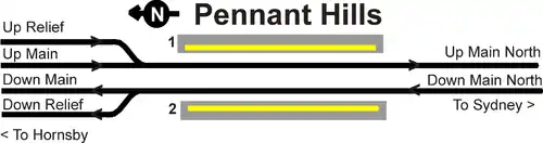 Pennant Hills station opened on 17 September 1886.[2] Immediately north of Pennant Hills, a short four track section of the Main Northern line begins which runs to the next station at Thornleigh.[3]