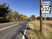 After this intersection, the road narrows back to two lanes and turns northeast into residential areas, reaching a junction with Maple Avenue.[4] PA 232 makes a curve to the north as it crosses Bristol Road into Northampton Township.[7] The route turns northeast again and continues past more housing developments with a few businesses.[4] At Richboro, the road crosses Ironworks Creek and passes shopping centers and businesses as Bustleton Pike merges into Second Street Pike and PA 232 continues due north. The route widens to four lanes and passes more commercial development as it crosses PA 332 (Almshouse Road/Newtown Richboro Road).[4][7] Following the PA 332 junction, the road narrows to two lanes and passes more residential areas, with Worthington Mill Road branching to the northeast.[4] As the route approaches the Sacketts Ford Road intersection, the settings become more rural as the road passes near farms and woods with some homes.[4][7]