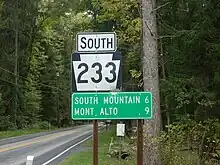 PA 233 begins at an intersection with PA 997 in the borough of Mont Alto in Franklin County, heading east on two-lane undivided Park Street. The road passes homes, becoming the border between Quincy Township to the north and Mont Alto to the south before fully entering Mont Alto again. The route heads entirely into Quincy Township as it passes the Penn State Mont Alto university campus. From here, PA 233 becomes Rocky Mountain Road South and continues near Mont Alto State Park and heads into Michaux State Forest. The route turns northeast to ascend Rocky Mountain, a part of the South Mountain range, becoming Rocky Mountain Road. The road enters Guilford Township and makes a hairpin turn to the south to descend the mountain, crossing back into Quincy Township. PA 233 curves east before heading northeast through more forests and entering Guilford Township again, where it crosses the Appalachian Trail. The route turns north-northeast and runs through more mountainous areas, heading into Greene Township. Here, PA 233 passes through Caledonia and crosses US 30 before running through forested Caledonia State Park as Pine Grove Road, turning northeast.[2][3]