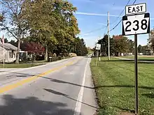 Pennsylvania Route 238 (PA 238) is a state highway located entirely in York County, Pennsylvania. The western terminus of the route is at PA 74 in Shiloh. The eastern terminus is at PA 181 in Emigsville. PA 238 is a two-lane undivided road passing through suburban and rural areas to the northwest of York. The route has an interchange with Interstate 83 (I-83) at exit 24 in Emigsville. The road between Shiloh and Emigsville was paved in the 1930s. PA 238 was assigned to its current alignment in the 1960s.