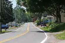 A distance later into Dallas Township, PA 415 becomes a divided highway, intersecting with PA 118 near the Chapel Hill Memorial Park. Paralleling the southern side of the park, the highway continues through a wealthy community, passing along power lines and a large recreational vehicle dealership. At an intersection with Briar Crest Road, PA 415 enters the small community of Idetown. The highway leaves Idetown shortly after entering, beginning a short northward progression into the community of Shawanese, a wealthy community on the side of the borough of Harveys Lake. In Shawanese, PA 415 reaches an intersection with SR 1415 (Lakeside Drive), where the right-of-way of PA 415 splits into two bi-directional highways.[2]