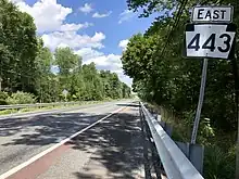 In the 1930s, PA 443 was realigned at Green Point to head west to US 11/US 15/US 22/US 322 (North Front Street) on the east bank of the Susquehanna River north of Rockville along a paved road. The former alignment of the route between Jonestown and Green Point became a northern extension of PA 72. PA 925 was extended west from New Ringgold to US 122 (now PA 61) west of Orwigsburg in the 1930s; the route replaced the section of US 122 (which had replaced US 120) on West Market Street in Orwigsburg that was realigned to bypass the borough to the southwest. At this time, the entire length of PA 925 was paved. In addition, the highway between PA 29 south of South Tamaqua and Lehighton was constructed as an unnumbered paved road in the 1930s.[10] In the 1940s, PA 443 was extended east from US 122 in Schuylkill Haven to US 209/US 309 in Lehighton along its current alignment. The route replaced the entire length of PA 925 between Orwigsburg and South Tamaqua. In addition, the route was widened to a multilane road between the border of Dauphin and Lebanon counties and Fort Indiantown Gap.[11] In 1977, US 22/US 322 were shifted from North Front Street to a freeway a short distance to the east; the western terminus of PA 443 remained at unnumbered North Front Street a short distance to the west of an interchange with the US 22/US 322 freeway. The route was widened into a divided highway in the vicinity of the interchange.[12][13]