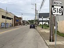 PA 518 begins at an intersection with PA 18 in the city of Hermitage, heading northwest on two-lane undivided Longview Road. The road passes through wooded areas of homes, heading into the city of Farrell and becoming Sharon New Castle Road. In this area, the route heads through more dense residential development and intersects PA 418. PA 518 heads into commercial areas and becomes the border between the city of Sharon to the north and Farrell to the south, with the name of the road becoming Division Street. The route continues past a mix of homes and businesses, and becomes city-maintained after Indiana Avenue.[3][2] It fully enters Sharon as it turns north onto Stambaugh Avenue. The road is lined with several residences as it comes to an intersection with U.S. Route 62 (US 62). PA 518 passes a mix of residential and commercial establishments as it reaches US 62 Business (US 62 Bus.). At this point, state maintenance resumes and the route turns west to form a concurrency with US 62 Business on East State Street.[2] The road continues west past several businesses along with some homes.[4][5]