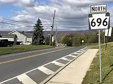 When Pennsylvania first legislated routes in 1911, what is now PA 696 was not assigned a number. By this time, a paved road ran between Chambersburg and Scotland.[5] In 1928, the road between US 11 in Shippensburg and Newburg was designated as part of PA 333, which was paved.[6] On February 25, 1929, a bill passed that authorized the state to take over the road between Newburg and McCrea.[7] PA 696 was designated in 1930 to run from US 11 in Chambersburg northeast to PA 996 (Main Street) in Scotland, following Broad Street, Scotland Avenue, and Scotland Road.[8] In 1937, PA 696 was extended north from Scotland to PA 641 in Newburg, replacing the former section of PA 333 between Shippensburg and Newburg.[9][10] The entire length of PA 696 was a paved road in the 1930s along with the unnumbered road from Newburg north to PA 944 (now PA 997).[10] In the 1960s, the south end of PA 696 was moved to its current location at PA 997 near the I-81 interchange, with the road between Chambersburg and Scotland becoming unnumbered.[11] PA 696 was extended north from Newburg to its present northern terminus at PA 997 in the 1970s.[12]