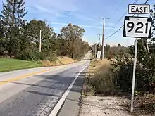 When Pennsylvania legislated routes in 1911, what is now PA 921 was not given a number.[4] PA 921 was designated in 1928 to run from PA 24 (now PA 181) in Manchester east to Mount Wolf. The western and eastern portions of the route were paved while the middle section was unpaved.[5] By 1930, the entire length of PA 921 between Manchester and Mount Wolf was paved.[6] The unnumbered road between Dover and Manchester was paved in the 1930s.[7] In the 1940s, PA 921 was extended west from Manchester to PA 74 in Dover.[8] PA 24 was extended from east of York to reach its northern terminus at PA 921's eastern terminus in Mount Wolf in the 1970s.[9]
