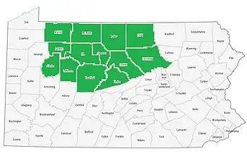 The Pennsylvania Wilds comprises all of the following 12 counties: Warren, McKean, Potter, Tioga, Lycoming, Clinton, Elk, Cameron, Forest, Clearfield, Clarion, Jefferson, and the northwestern part of Centre county.[3]