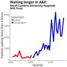 Four-hour target in the emergency department quarterly figures from NHS England Data from https://www.england.nhs.uk/statistics/statistical-work-areas/ae-waiting-times-and-activity/