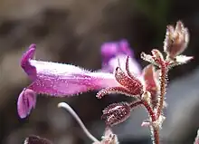 This plant was first described in 1998.[4] It is a perennial herb growing up to about 28 centimeters in maximum height. The clusters of stems arise from a woody caudex and thick taproot. The leaves are lance-shaped and borne on winged petioles. They are up to 3.5 centimeters long including the petioles and are coated in short white hairs. The inflorescence is a thyrse of flowers. The flower has a hairy, glandular calyx of sepals and a purple or reddish corolla between 1 and 2 centimeters long. The staminode is hairless. Blooming occurs in June through August.[3]