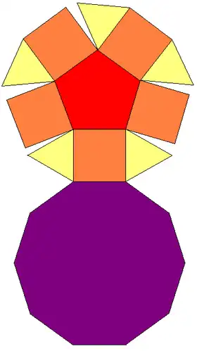 | Faces | 5 triangles 5 squares 1 pentagon 1 decagon |
