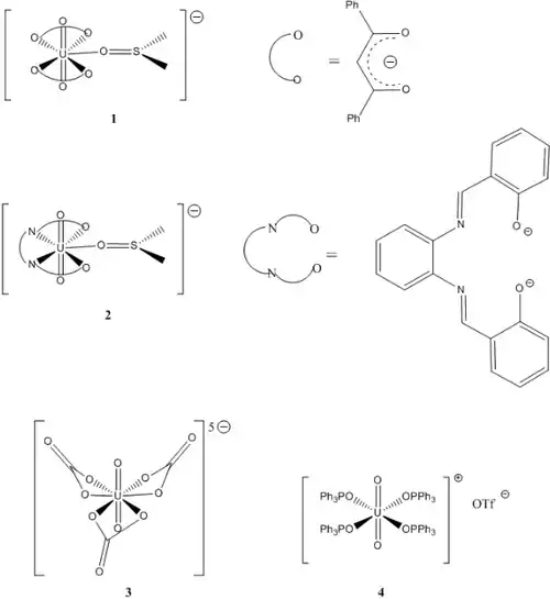 - ↑ Mizuoka, K.; Kim Re, S.Y.; Hasegawa, M.; Hoshi, T.; Uchiyama, G.; Ikeda, Y. (2003). "Electrochemical and Spectroelectrochemical Studies on UO2(saloph)L (saloph =N,N'-Disalicylidene-o-phenylenediaminate, L = Dimethyl Sulfoxide orN,N-Dimethylformamide)". Inorg. Chem. 42 (4): 1031–1038. doi:10.1021/ic0260926. PMID 12588135.