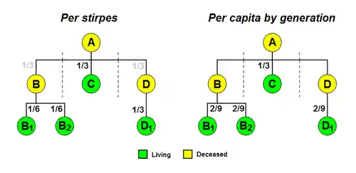 Per stirpes (/pɜːr ˈstɜːrpz/; "by roots" or "by stock")[1] is a legal term from Latin, used in the law of inheritance and estates. An estate of a decedent is distributed per stirpes if each branch of the family is to receive an equal share of an estate. When an heir in the first generation of a branch predeceased the decedent, the share that would have been given to that heir would be distributed among that heir's issue in equal shares. It may also be known as strict per stirpes[2] or the old English approach,[3] and differs from distribution per capita, as members of the same generation may inherit different amounts.[4] In section 33 of the Wills Act 1837 in England and Wales, it is called according to their stock.[5]