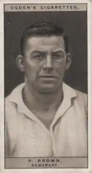 "P. Brown' Dewsbury, (Northern Rugby League.) Percy Brown was born at Normanton, and can be regarded as a local discovery. He can play in any position forward, but he is usually in the front row, and is regarded as one of the finest "stickers" in Yorkshire. He has had county honours, and has been considered for International distinction. Brown is as prominent in the loose as in tight pack work and he is sure to claim further honours" [2]