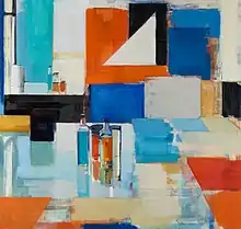 Schwartz's early career concentrated on painting and drawing traditional self-portraits,[3] portraits,[4] and still lifes. In the early 2000s, she began to focus more on her studio as subject.[5] Her works, many of objects from her studio such as tables, books, and paint jars,[6] display prominent angles, shapes and lines. To guide her compositions, Schwartz centered and organized her work on a grid system.[7] In her completed paintings, faint grid lines weave throughout[8] though varied rather than rigid so the work is formal but not stiff.[9]