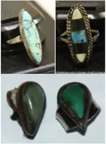 Perry County Jane Doe wore several pieces of jewelry. She was wearing two sterling silver rings with turquoise stones, one of which also contained onyx pieces that are believed to have originated in the Southwest, possibly having been made by Navajo or Zuni Indians inhabiting that area.[10] She also had a chain bracelet on her right arm and a turquoise necklace and earrings.[2][6] The jewelry led authorities to believe the victim had ties to Arizona, New Mexico or a similar region.[1]