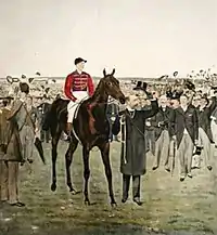 For the Derby at Epsom on 3 June, Marsh decided, perhaps in view of Persimmon's known temperament problems, to saddle the colt near the start, missing the traditional parade in front of the stands.[8] Persimmon started the 5/1 second choice in a field of eleven, with St Frusquin the 8/13 favourite. Ridden by John Watts, Persimmon was held up at the back of the field in the early stages as Bay Ronald and Gulistan made the running. Watts moved him forward steadily and he turned for home in third place behind Bay Ronald and St Frusquin, and the race soon developed into a match between the first and second favourites. St Frusquin had a slight advantage until the final furlong but Watts then made his challenge and Persimmon took the lead and ran on strongly to take the race by a neck,[15] winning rather more easily than the margin suggested.[16] The first royal victory for more than a century was greeted with prolonged and "deafening"[17] cheering and "tremendous enthusiasm",[18] with the police having difficulty clearing a way through the crowds for the Prince to lead in his winner.[19] Persimmon's winning time of 2:42.0 broke the race record by a full second.[20]