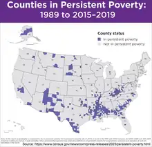 A 2009 U.S. federal law defined a persistent poverty county as one in which "20 percent or more of its population [has lived] in poverty over the past 30 years" according to the Census, which is done every 10 years.[1] The Economic Research Service (ERS) of the U.S. Department of Agriculture categorizes non-metropolitan counties by their dominant economic foundation and by characteristic policy type. Persistent poverty counties are defined as those where 20% or more of the county population in each of the last four decennial Censuses had poverty level household incomes.[2]