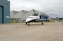 A British Aerospace Jetstream arrives to be used as an instructional airframe by AST. In the background is the original hangar 1, which dates back to the 1930s.
