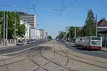 The housing estate in Petřiny was built between 1959 and 1969, with the intention of housing around 15,000 people, and was designed by architects Evžen Benda and Vojtěch Mixa. It was built on an empty field between the military hospital in Prague, the Obora Hvězda game reserve, and the crossroad at Vypich in Břevnov. The streets were named in 1962 and were initially named after communist personalities and World War II casualties.[2] Notable buildings in the estate include the Macromolecular Chemical Institute (Ústav makromolekulární chemie), in which Otto Wichterle worked, and a memorial to him can be found in front of the building today. Part of the area, as well as a tram stop and a student dormitory, is named Větrník after a windmill which functioned from 1722 to 1905, whose building now serves as a guesthouse.[3] The newest development of buildings in the housing estate, named Sídliště Hvězda, were designed by Vlado Milunić.[4]